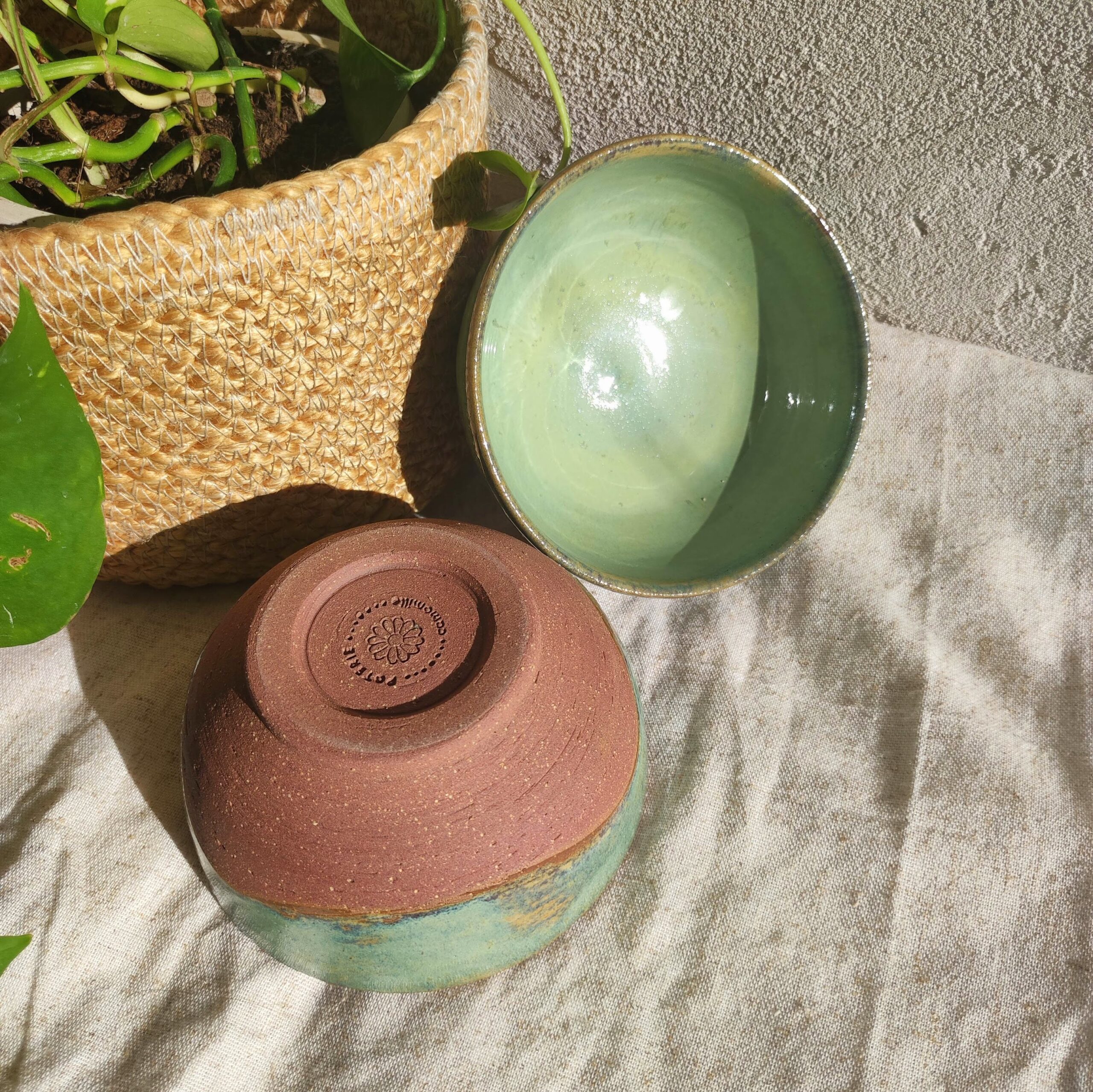 Deux bols en grès roux, fabriqués à la main et émaillés d’un vert irisé profond, aux nuances changeantes selon la lumière. Le feu leur a offert une personnalité propre, rendant chaque bol singulier. Parfaits pour les petits-déjeuners réconfortants, les soupes fumantes ou les rituels du quotidien, ces bols invitent à ralentir et à savourer l’instant, comme un petit sort de douceur posé sur la table.