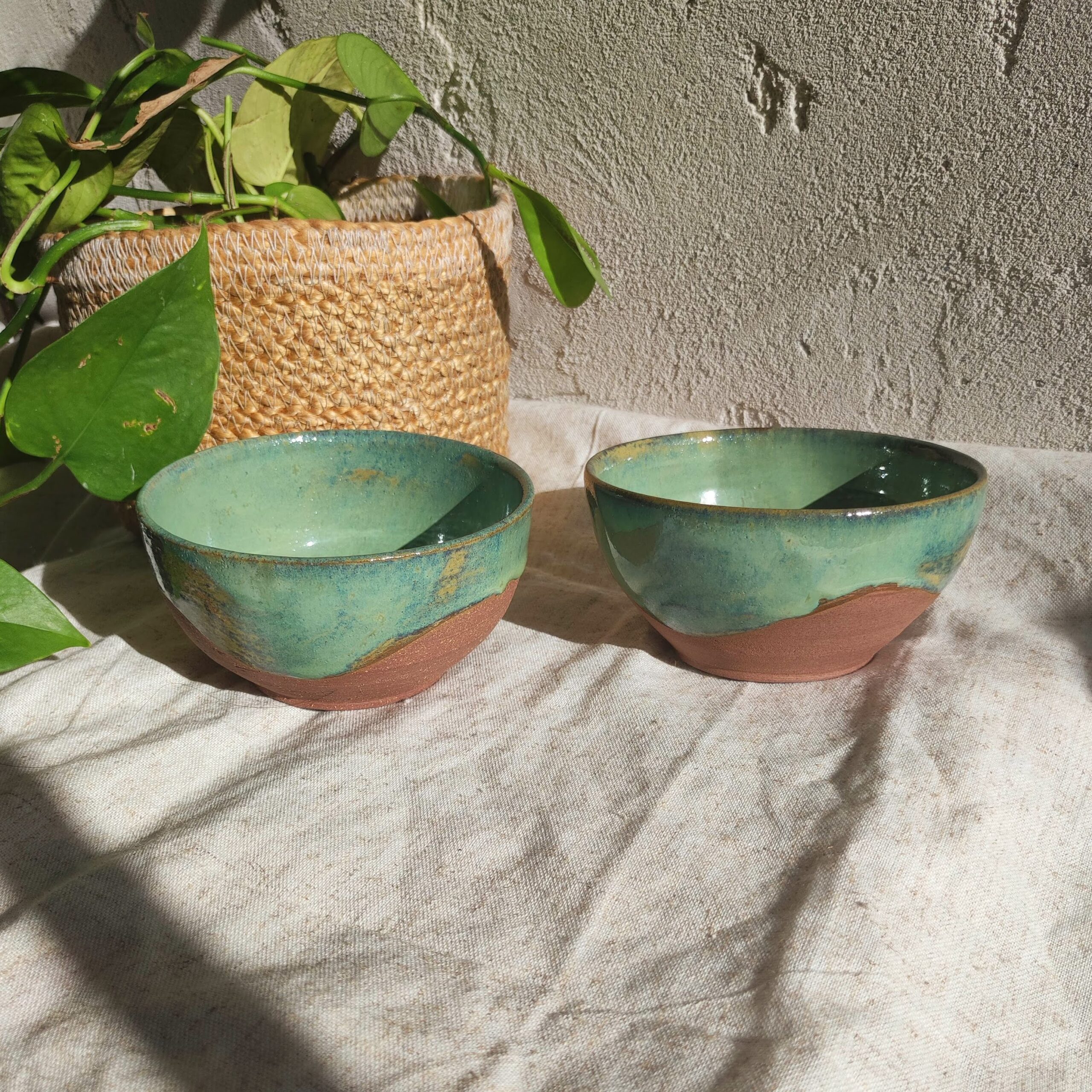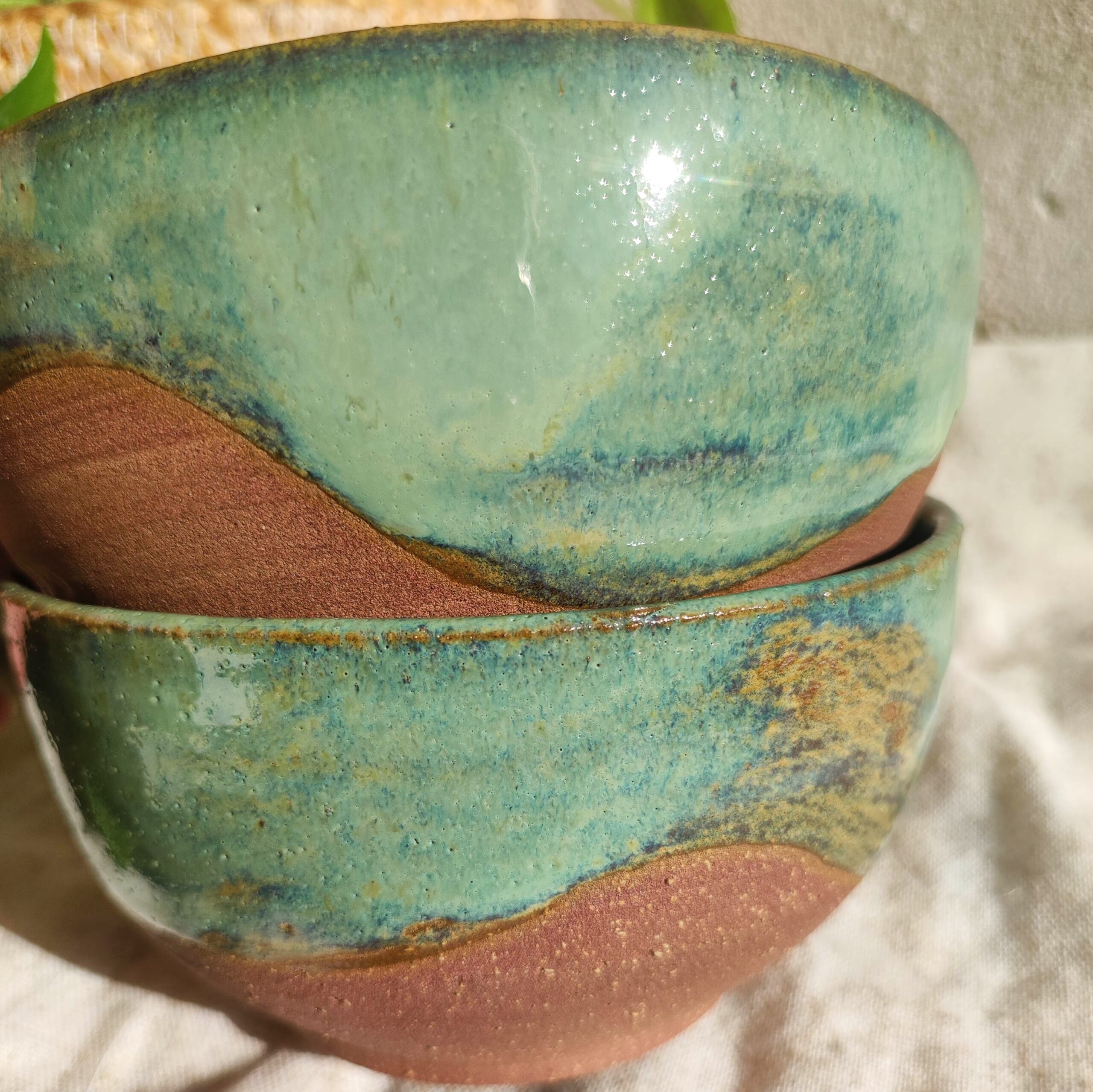 Lot de 2 bols en grès roux chamotté, émail vert irisé ✦