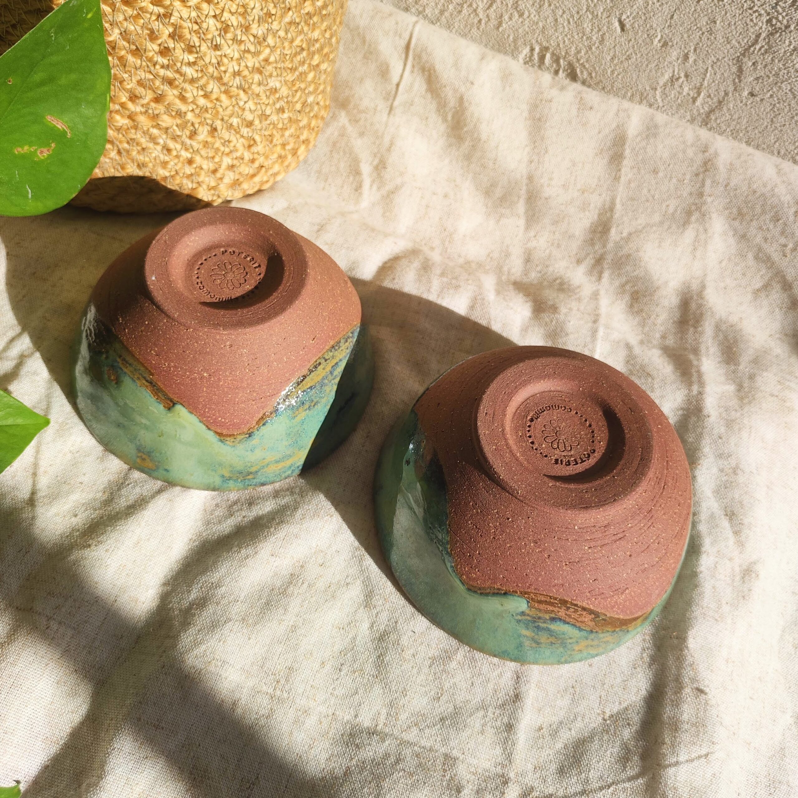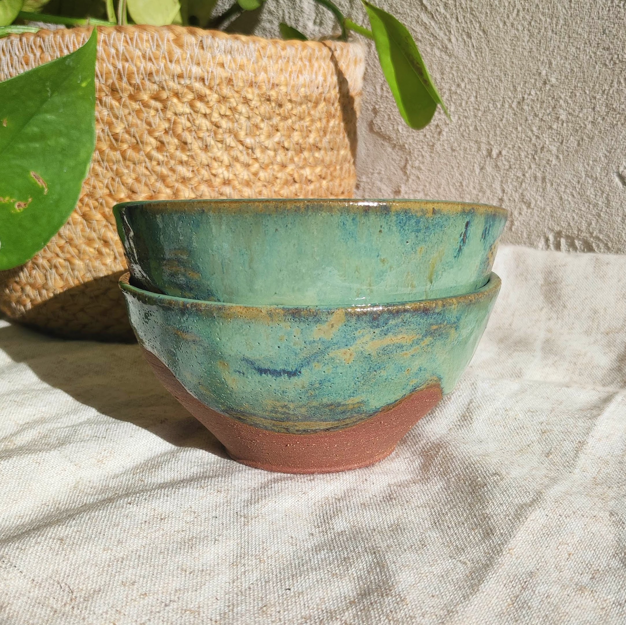 Lot de 2 bols en grès roux chamotté, émail vert irisé ✦