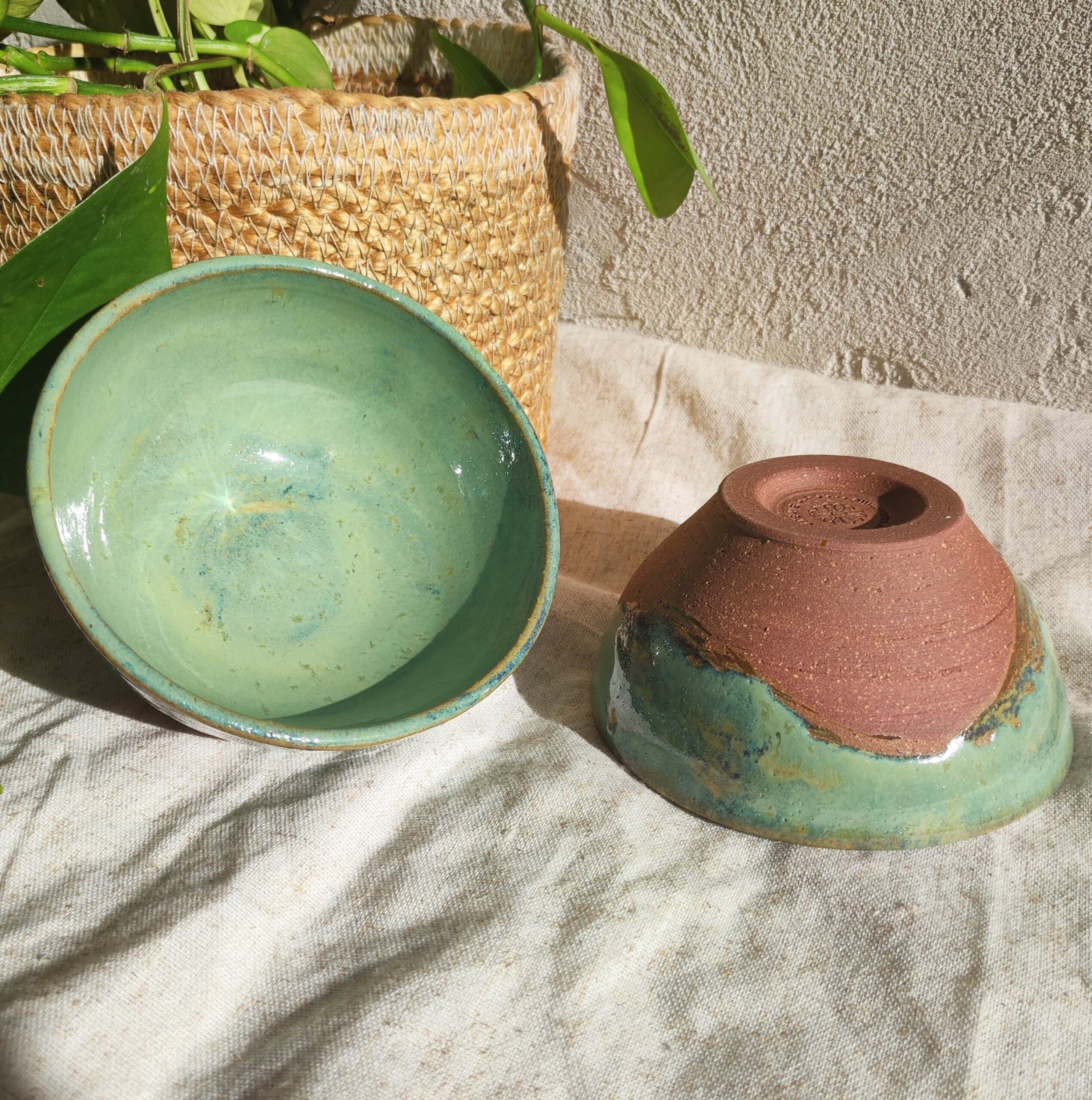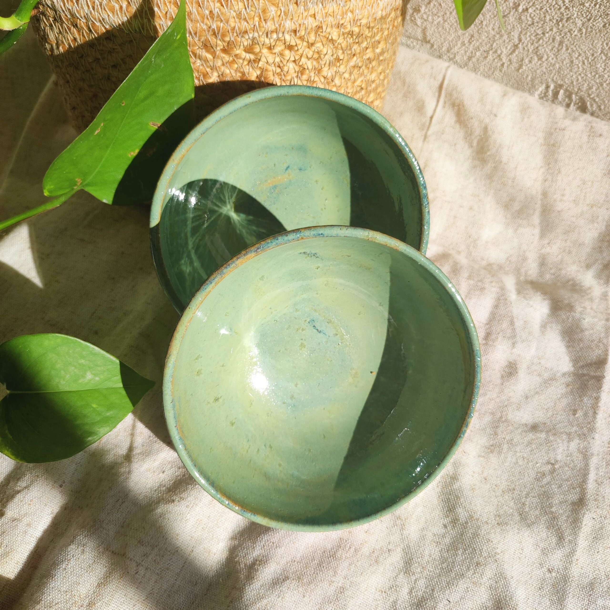 Deux bols en grès roux, fabriqués à la main et émaillés d’un vert irisé profond, aux nuances changeantes selon la lumière. Le feu leur a offert une personnalité propre, rendant chaque bol singulier. Parfaits pour les petits-déjeuners réconfortants, les soupes fumantes ou les rituels du quotidien, ces bols invitent à ralentir et à savourer l’instant, comme un petit sort de douceur posé sur la table.