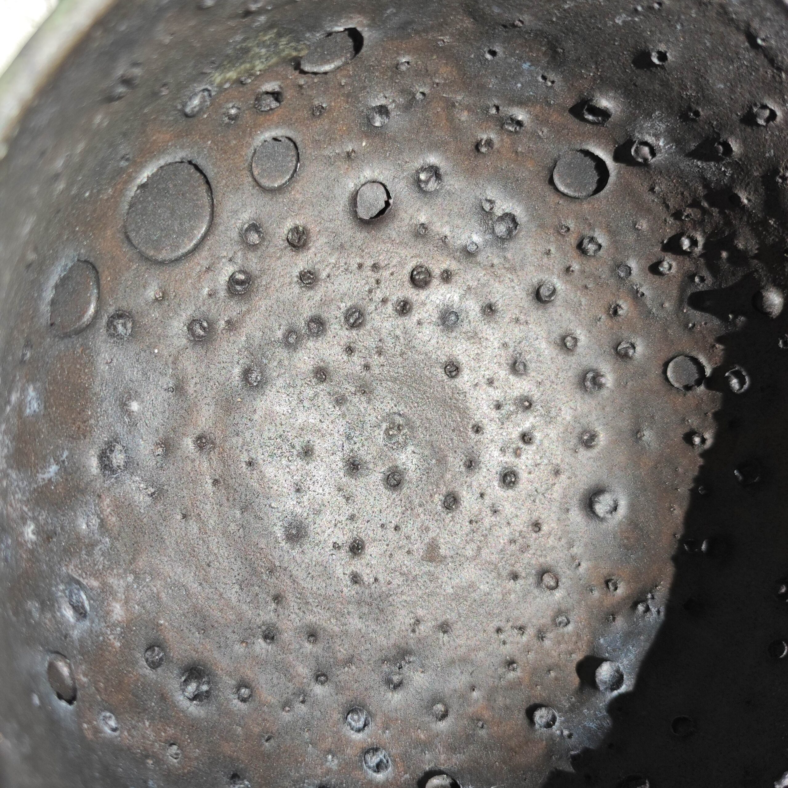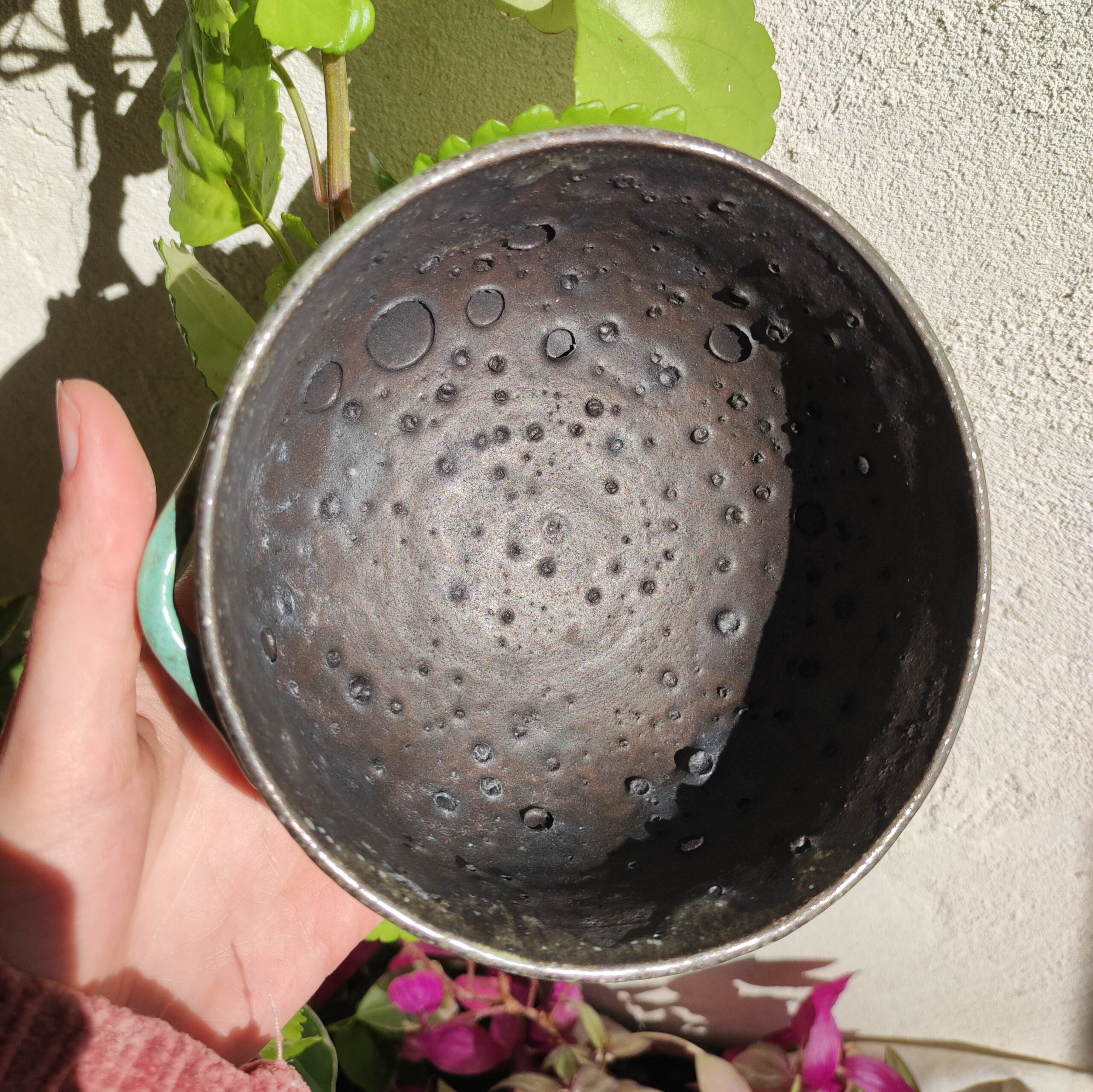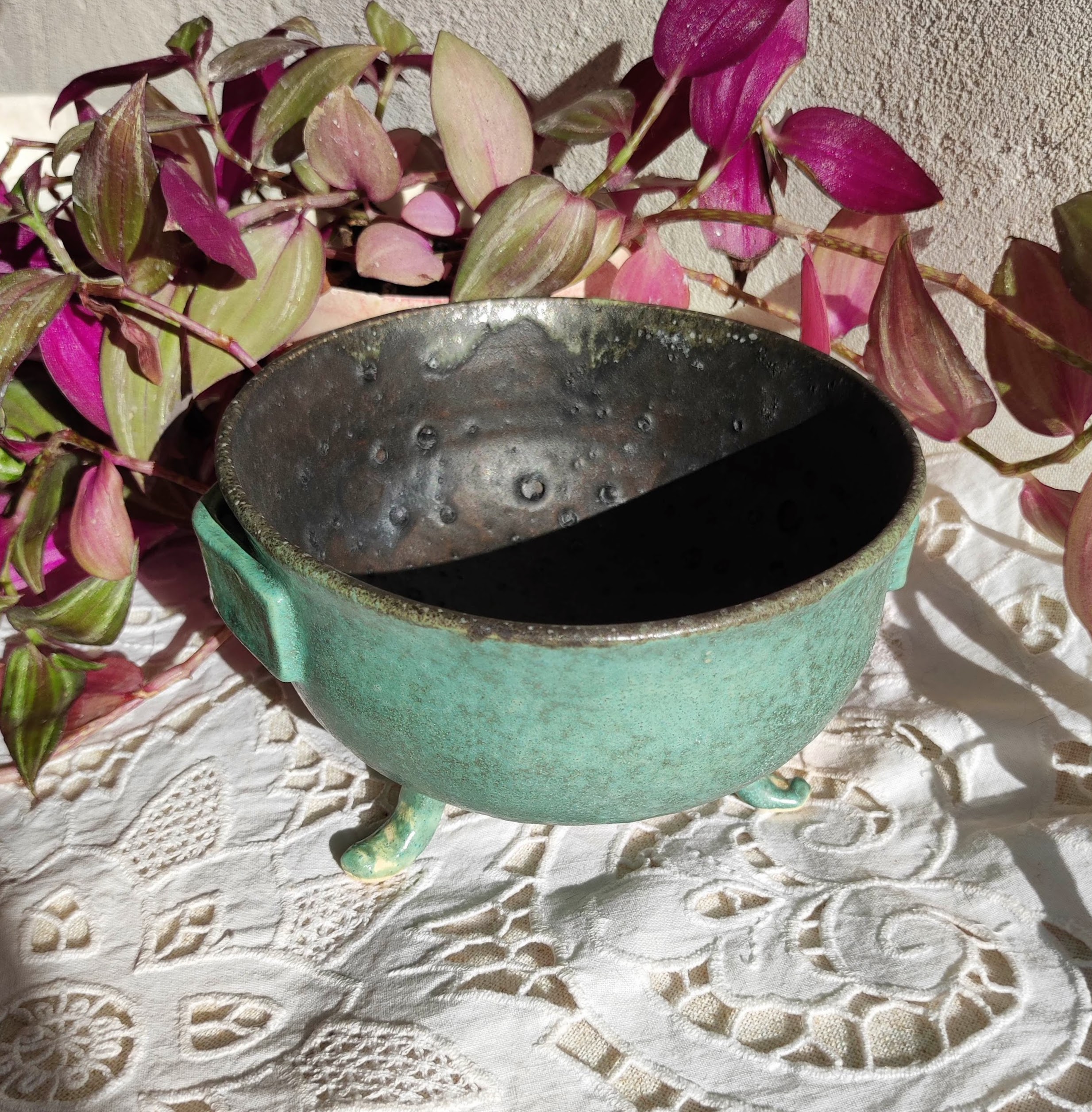 Chaudron de sorcière en faïence blanche, façonné à la main, recouvert à l’extérieur d’un émail vert cuivre aux effets vivants et à l’intérieur d’un noir profond évoquant la surface cratérisée de la lune.