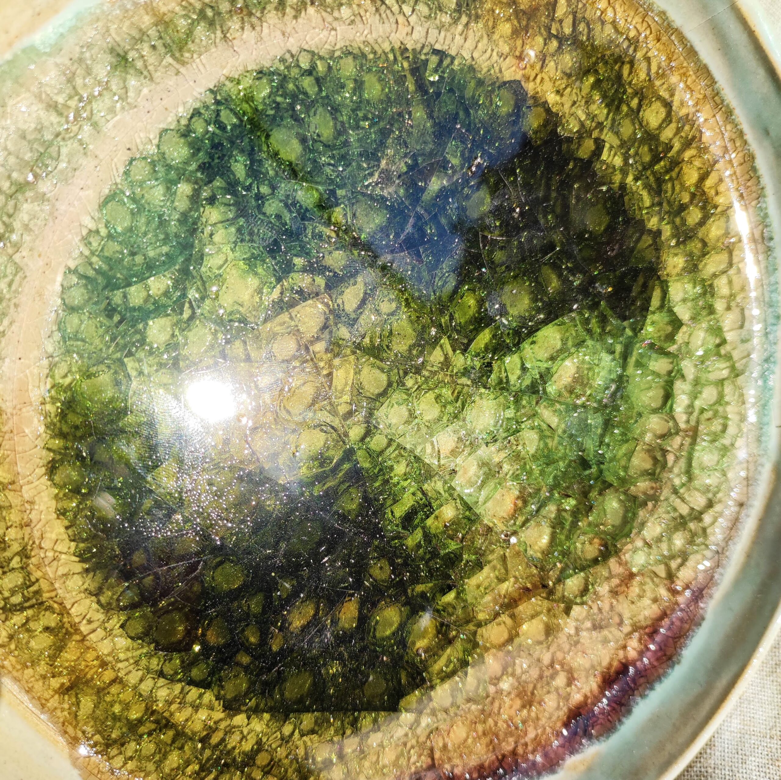 Assiette / coupelle / plat décoratif en céramique, façonné à la main et intégrant des fragments de verre fondus dans l’émail. Sous l’action du feu, le verre se transforme, créant des textures lumineuses et imprévisibles, véritables traces d’alchimie.