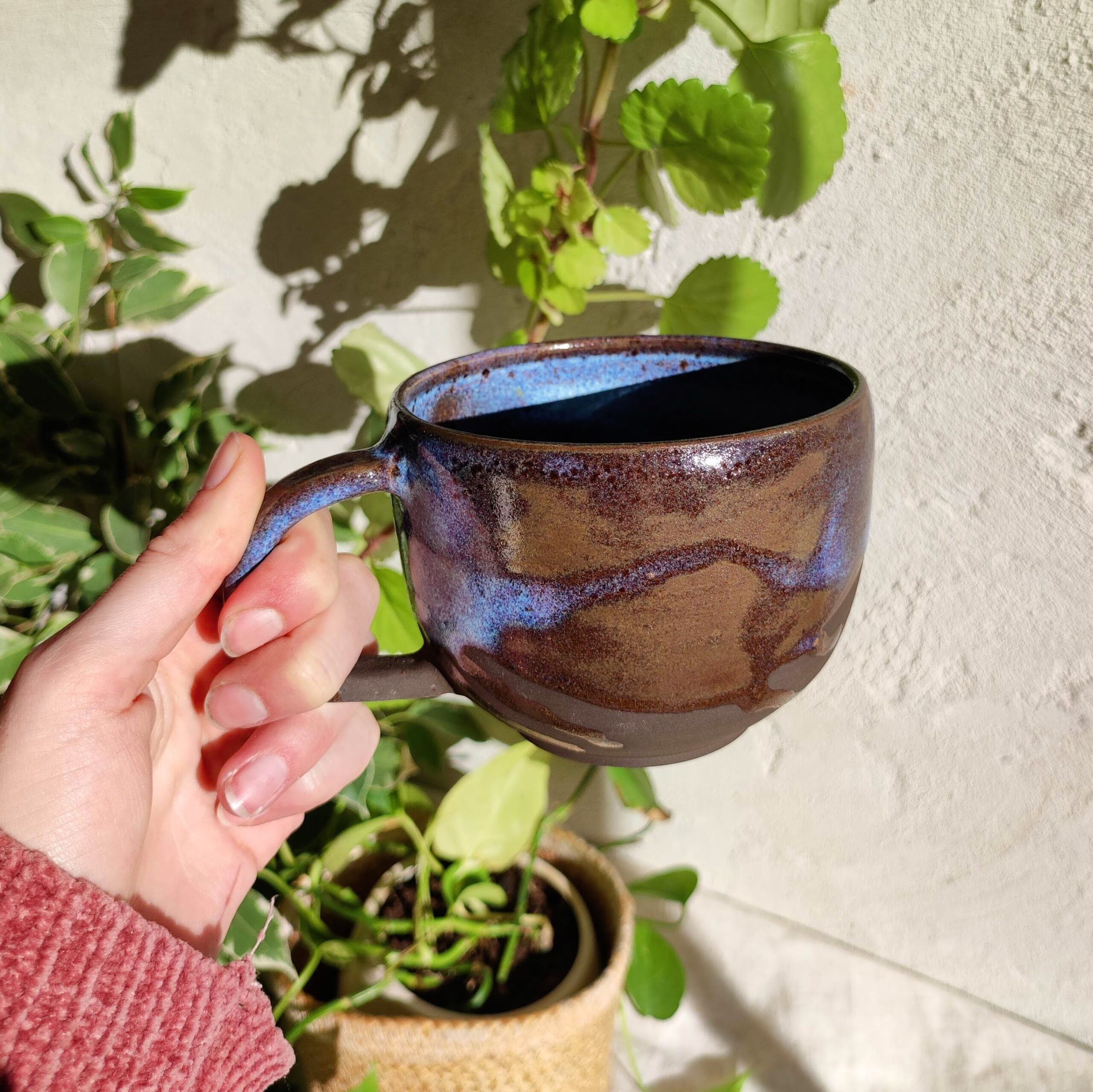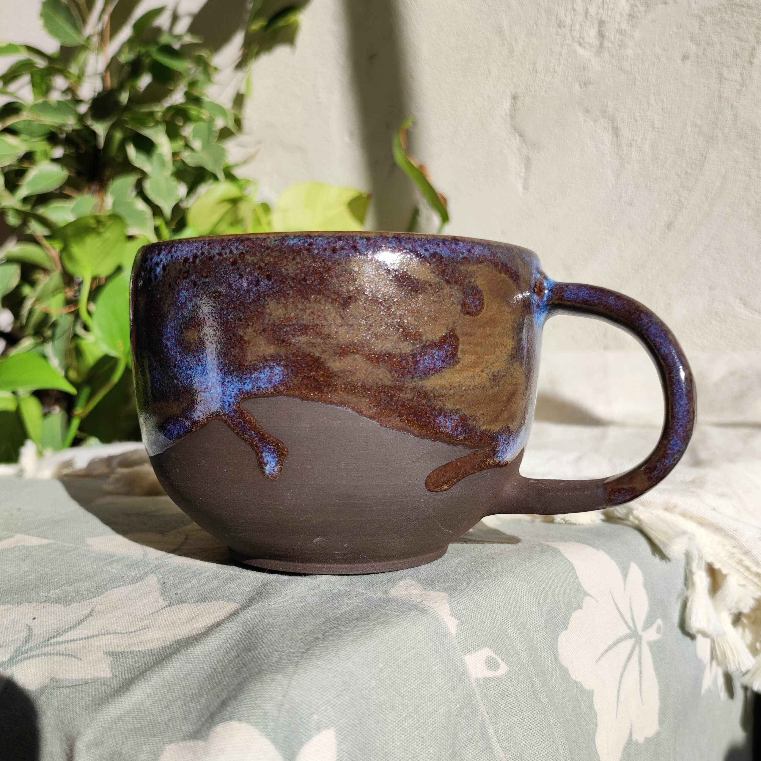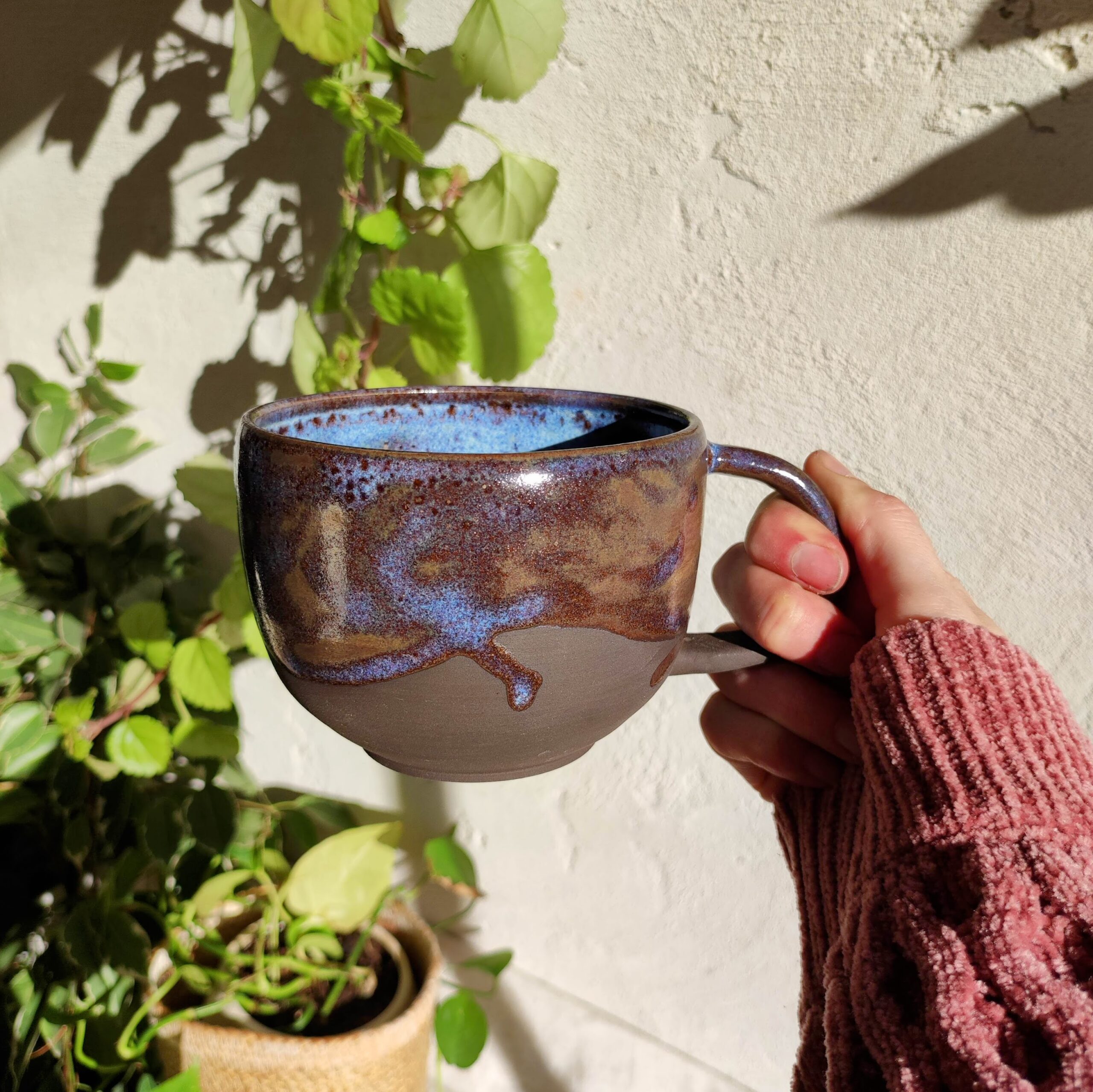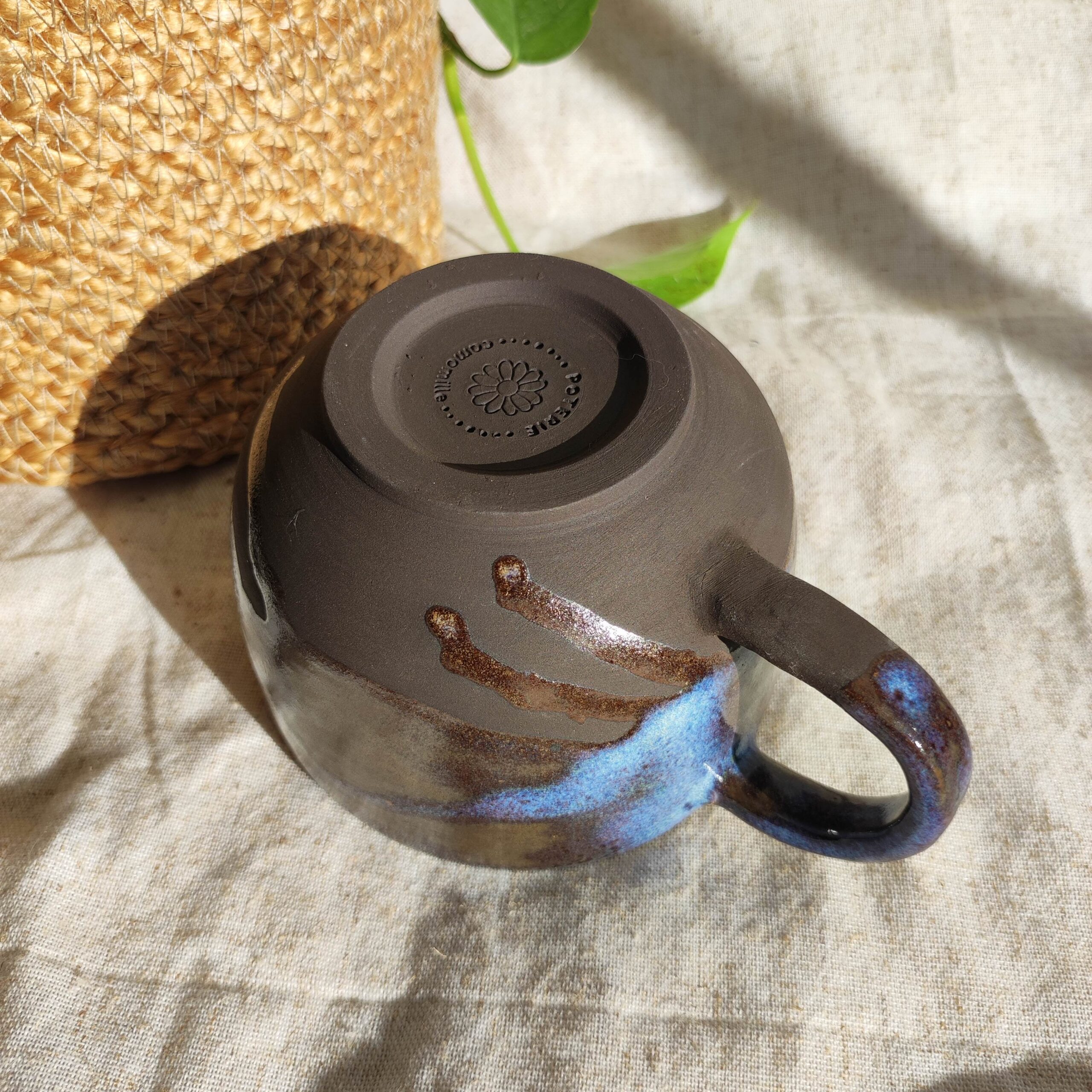 Mug artisanal en grès noir (teinte brun foncé), façonné à la main et recouvert d’un émail galaxie aux reflets célestes. Chaque pièce évoque un fragment d’univers, figé par le feu et le hasard de la cuisson.