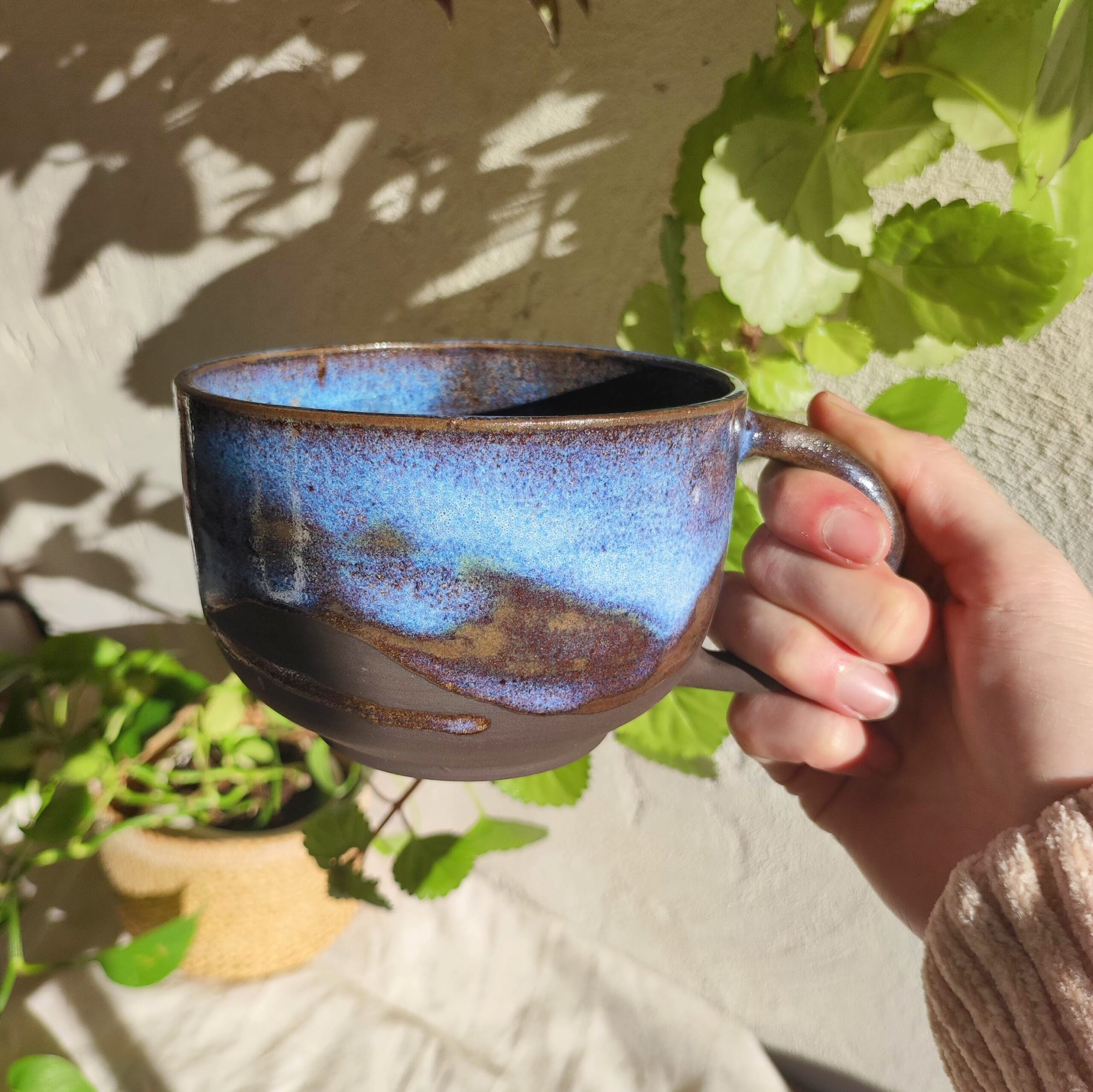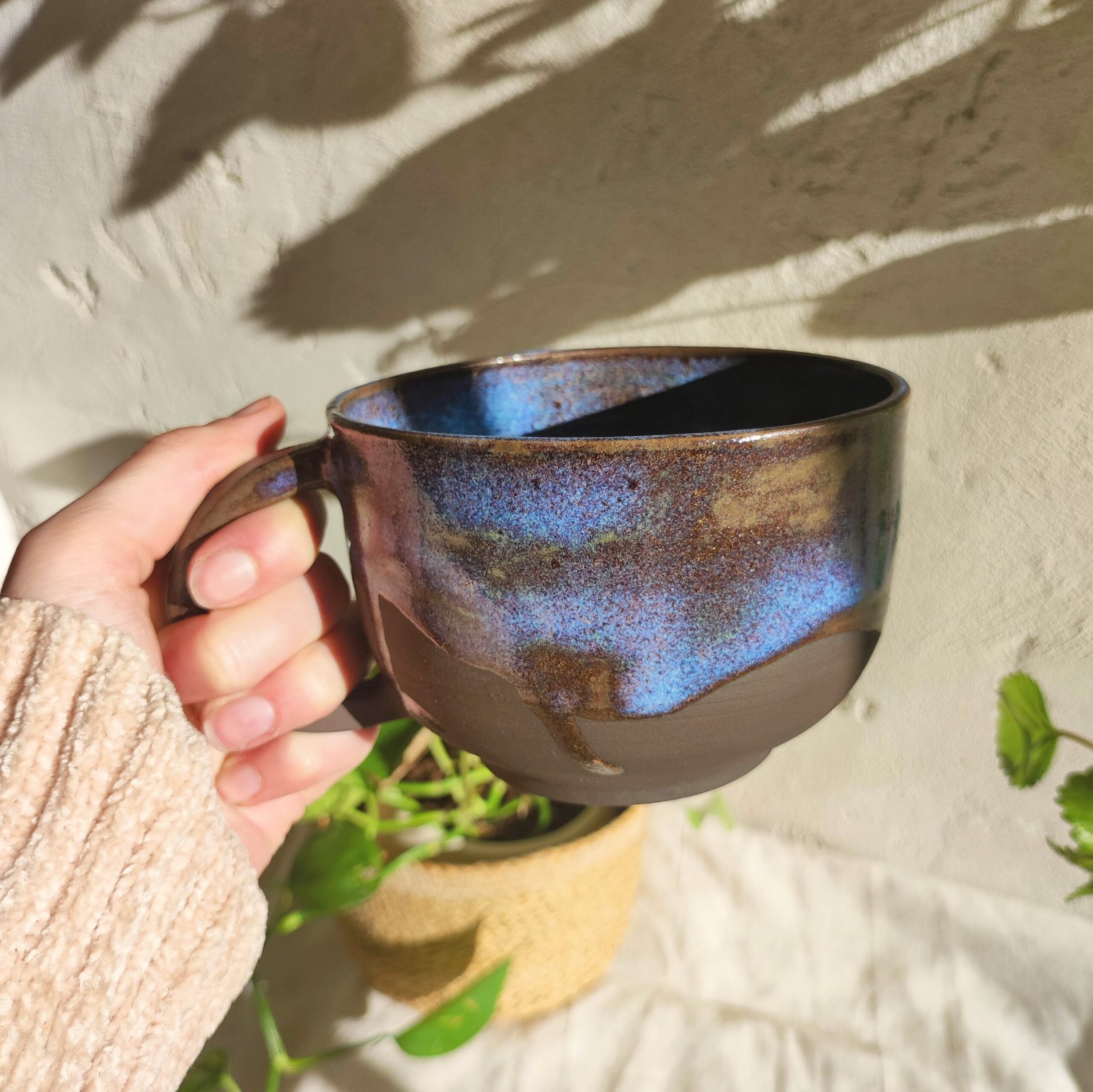 Mug artisanal en grès noir (teinte brun foncé), façonné à la main et recouvert d’un émail galaxie aux reflets célestes. Chaque pièce évoque un fragment d’univers, figé par le feu et le hasard de la cuisson.