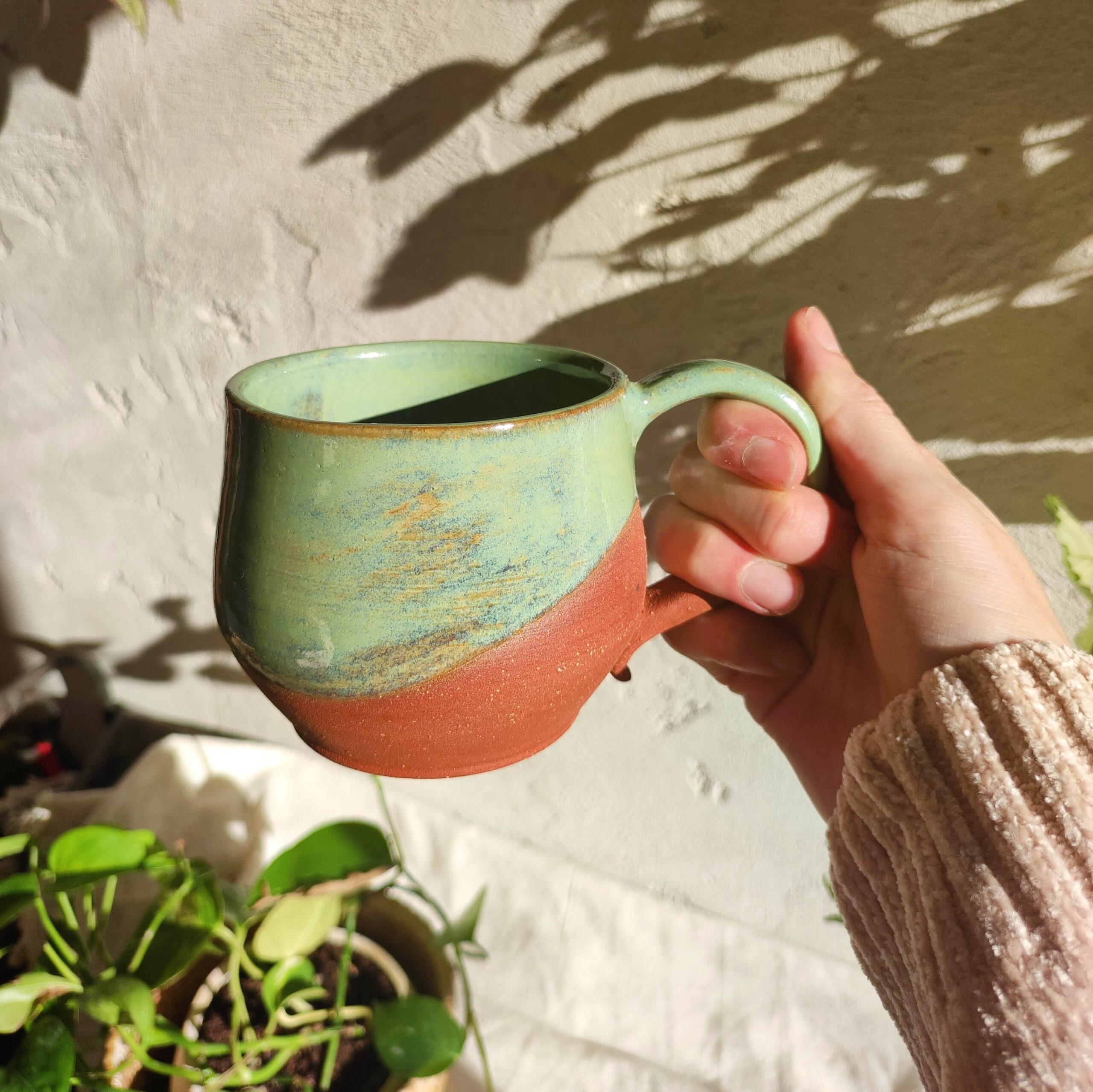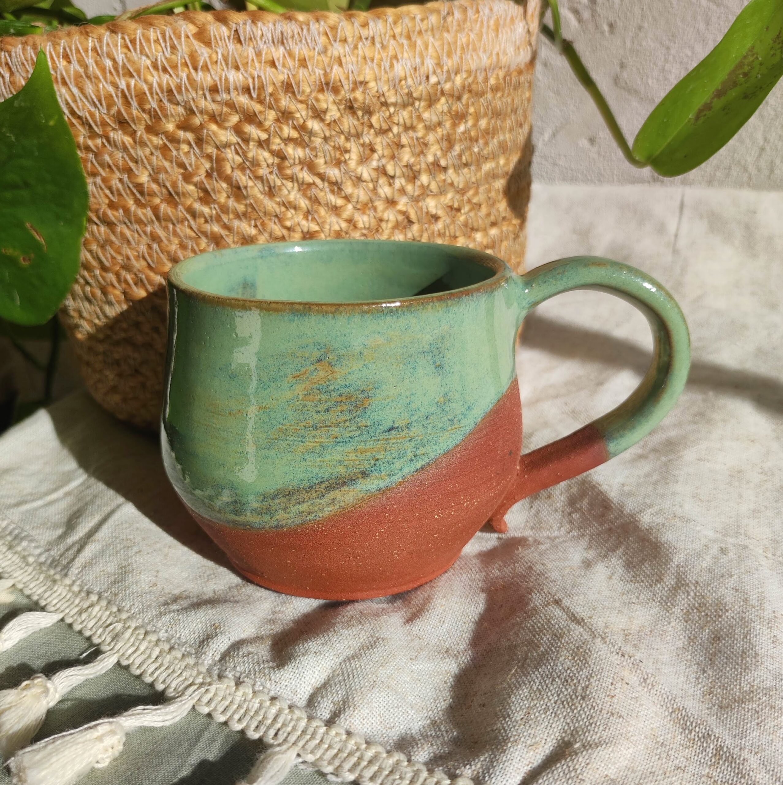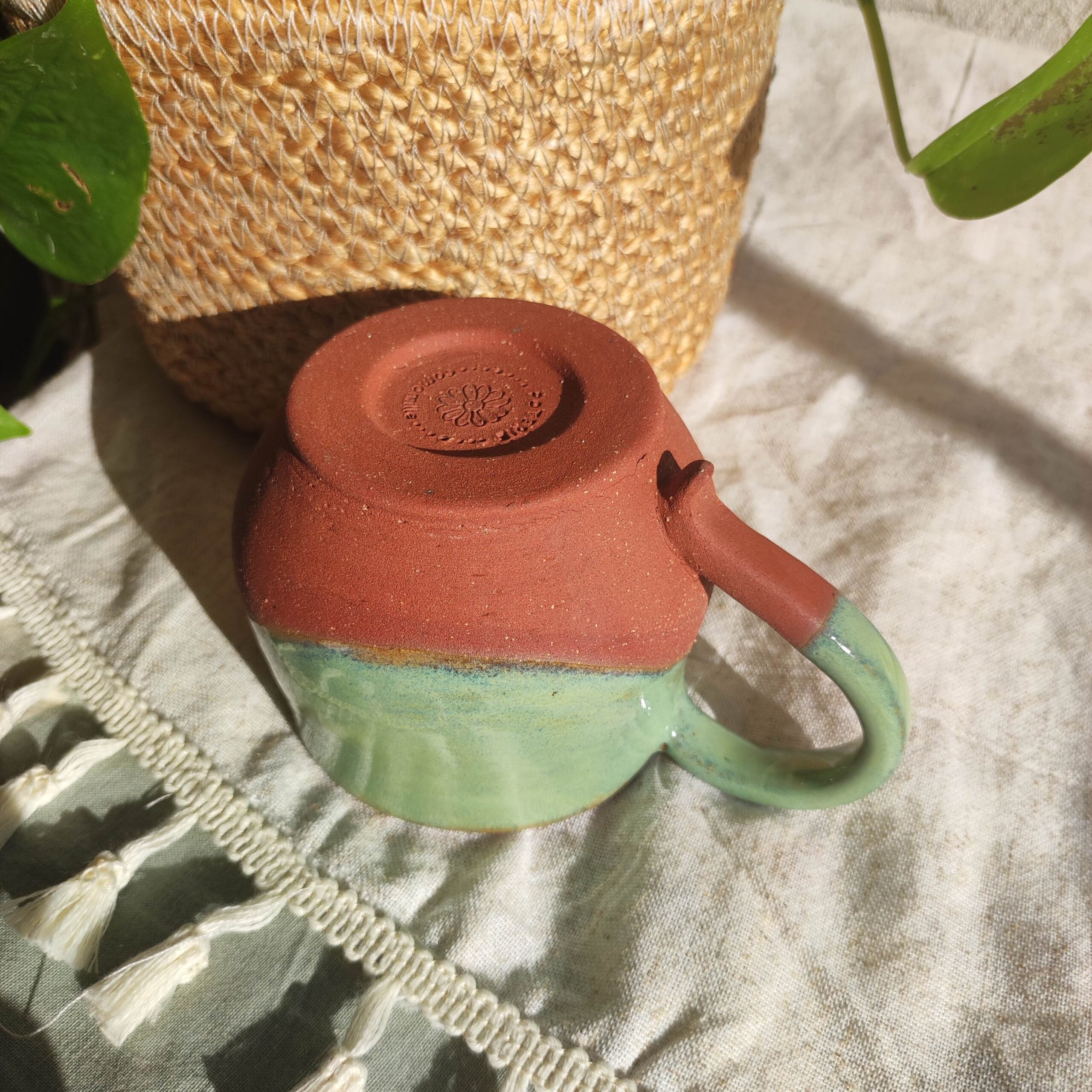 Mug à thé en grès roux, émail vibrant vert irisé ✦