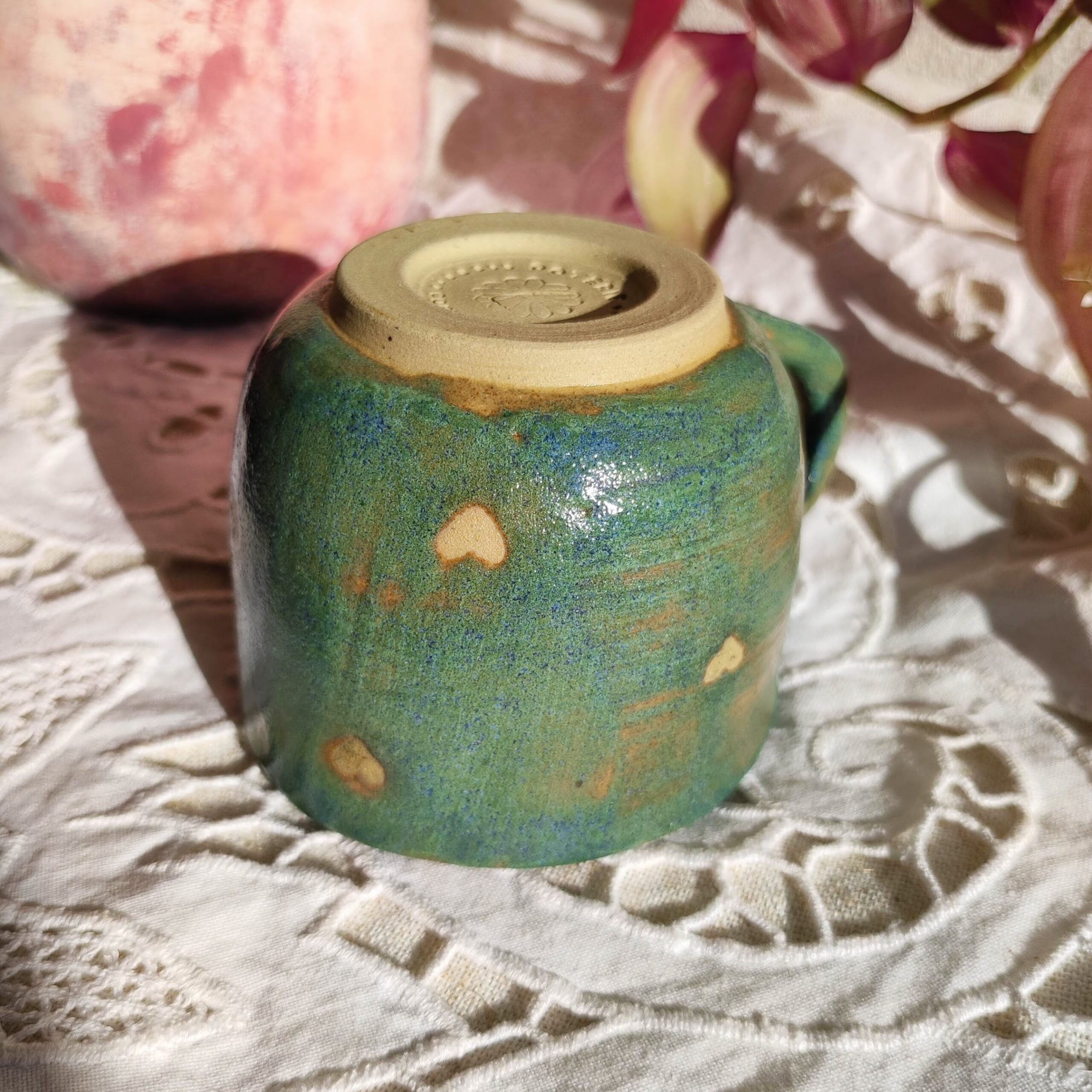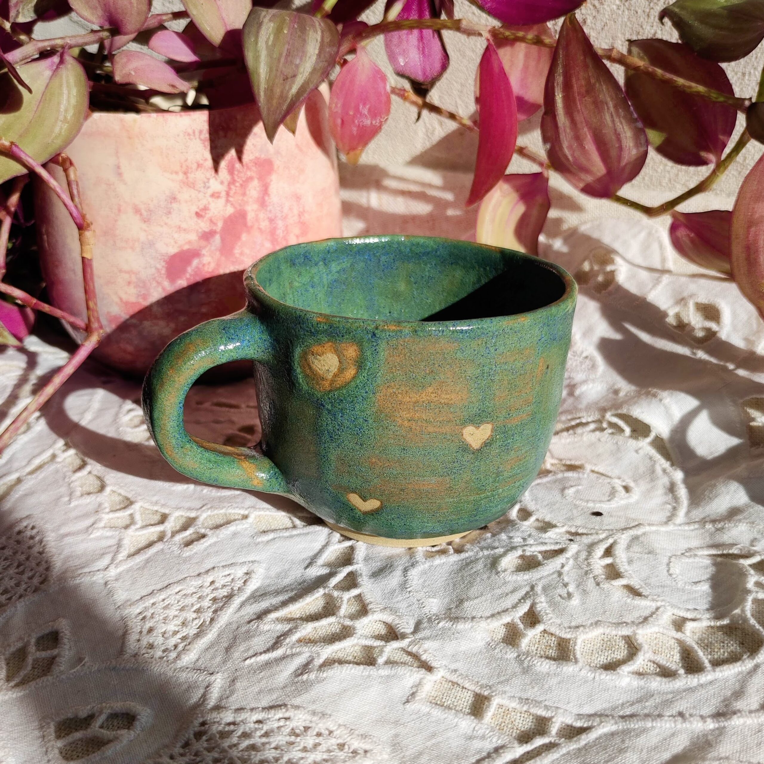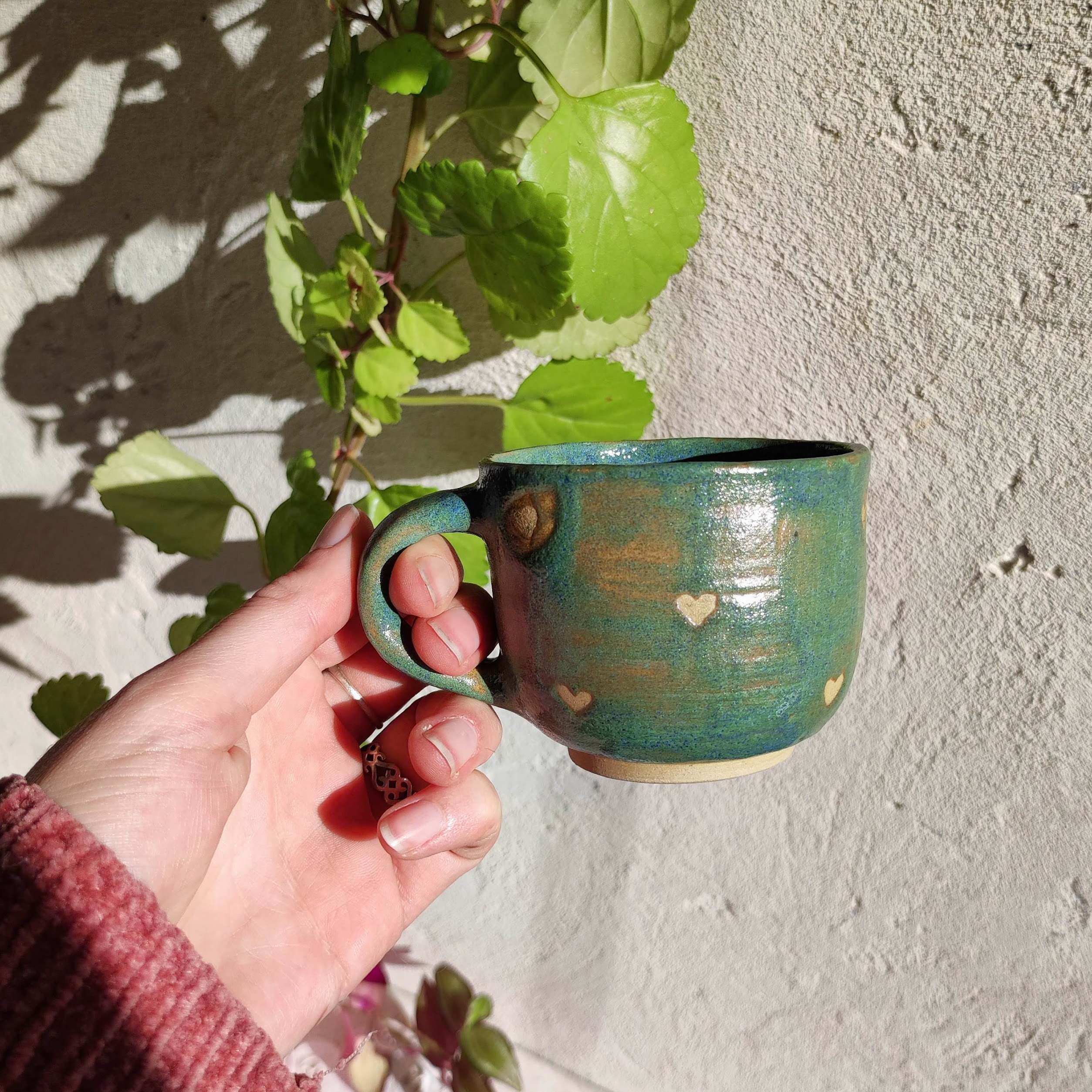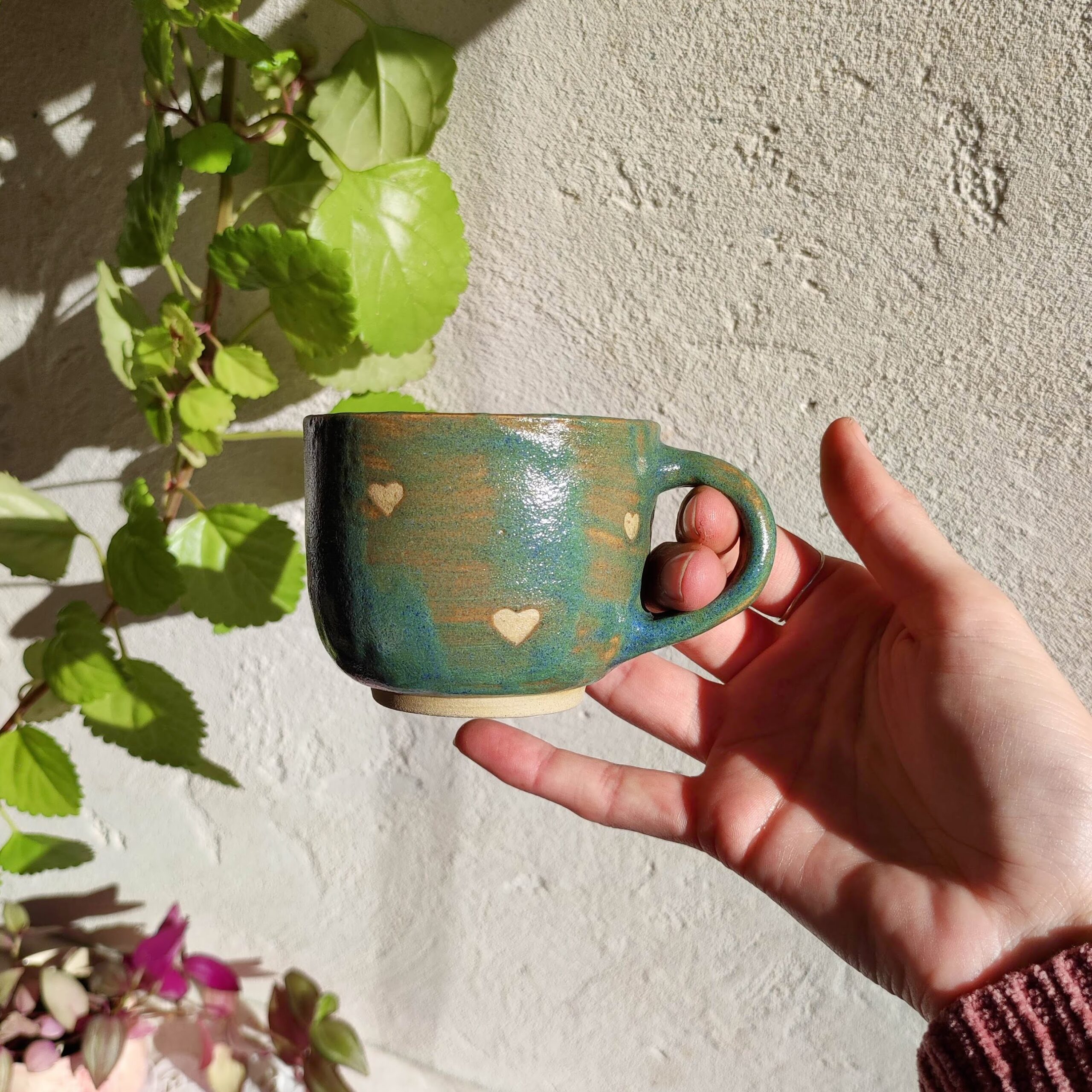 Tasse à café – expresso en grès de St Amand, émail vert et petits cœurs bruts ✦